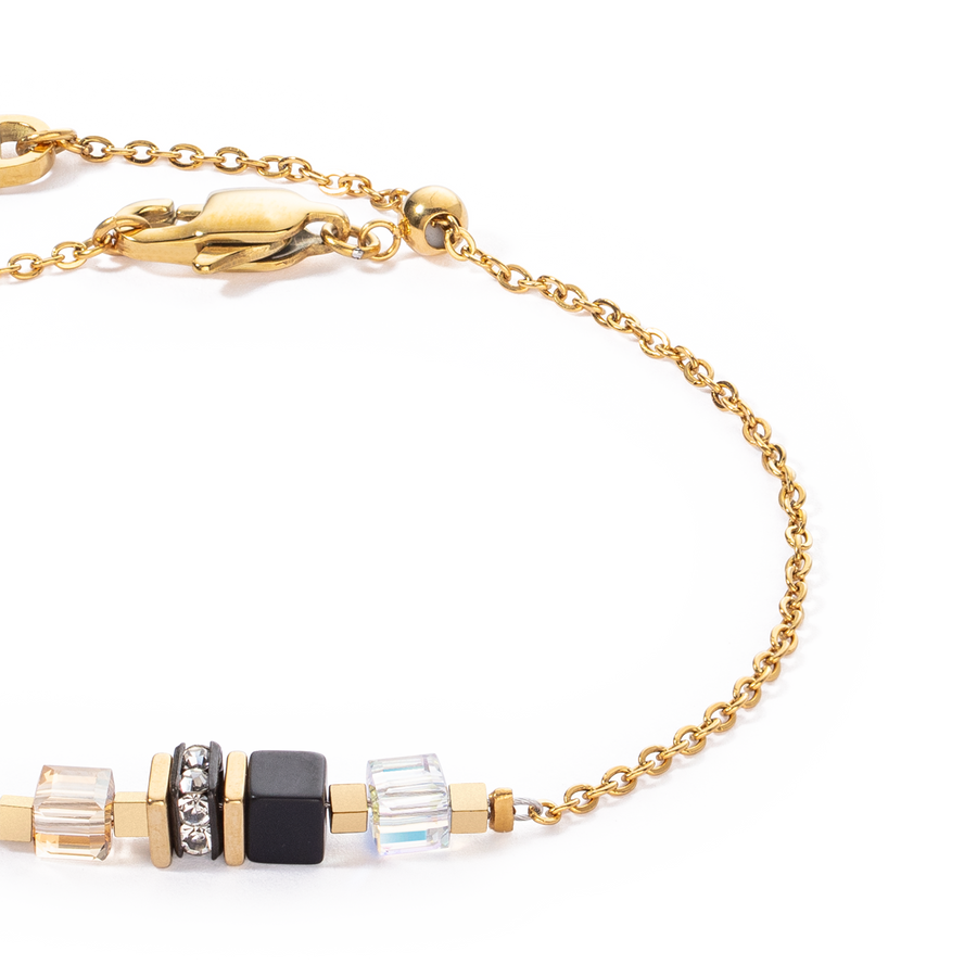 Enjoy the simple elegance of our Mini Cubes & Chain bracelet in gold and black - a sophisticated piece of jewellery that enchants with its delicate design and the unique charm of the materials. This piece of jewellery combines the timeless beauty of real stone cubes such as black onyx with the dazzling brilliance of Swarovski crystals. The innovative sliding clasp ensures a customised fit and allows you to adjust the length of the bracelet to your liking, ensuring optimum wearing comfort.