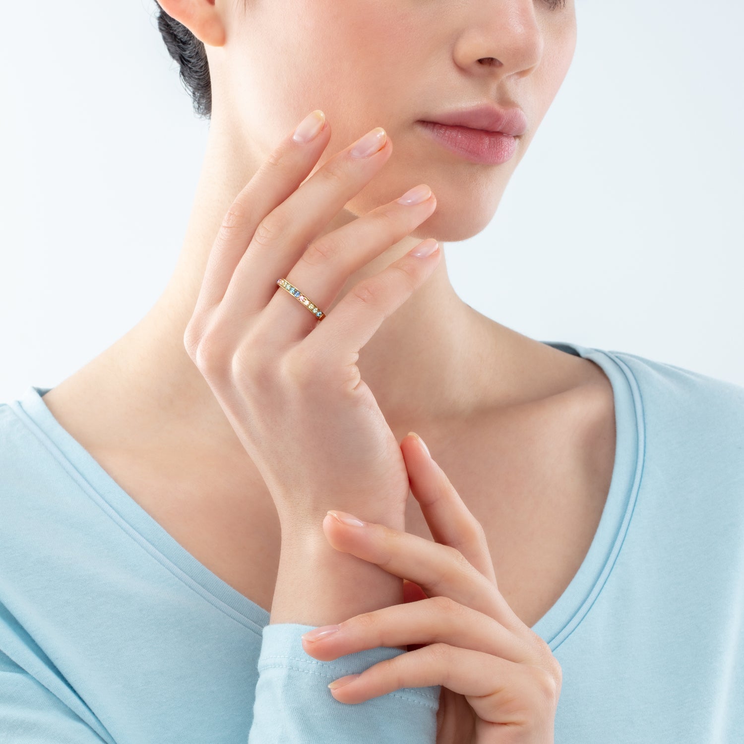 Ring layering involves spreading rings over many fingers, with the focus on the middle finger. So if you want to make a statement – for example, with a sparkling crystal ring – you should do it in the middle area of the hand. As a general rule, wear flashy and heavy rings at the bottom and go lighter and more delicate towards the top.