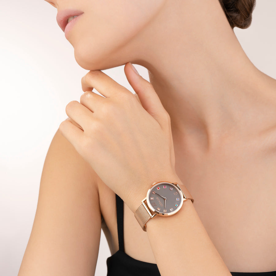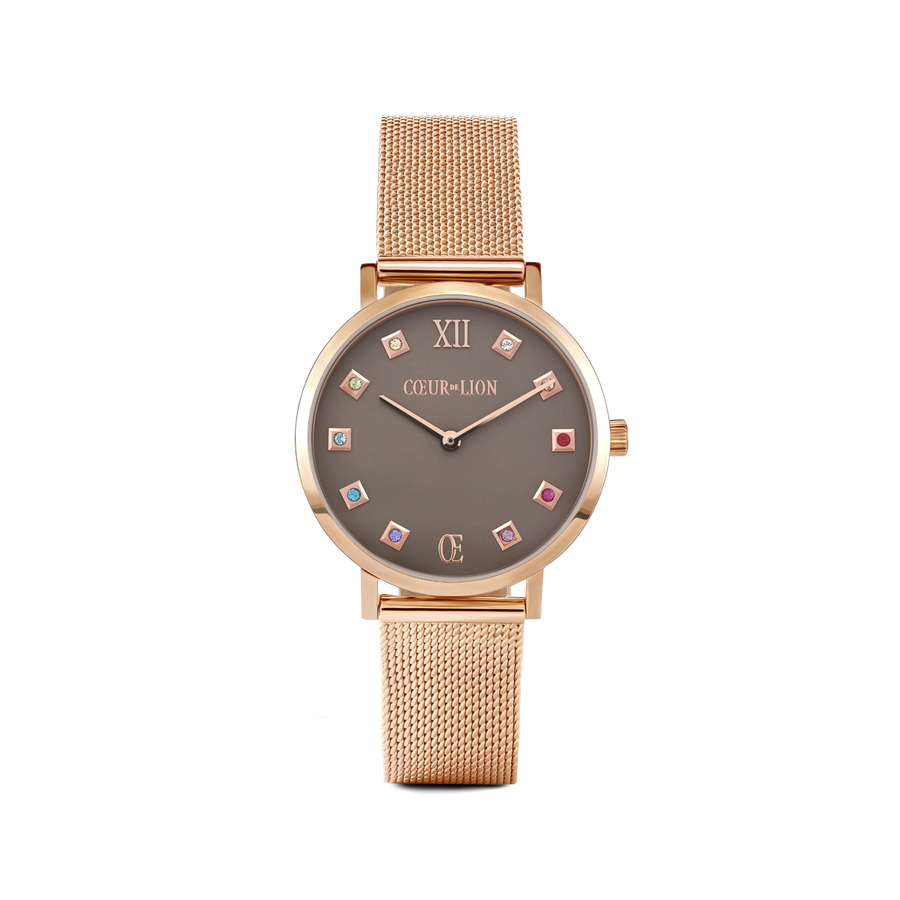 For female conquerors. A high-quality casing and Milanese strap made from rose gold stainless steel are complemented by a sandblasted-effect dial in stunning Mocha, finished with sparkling Swarovski® crystals for a burst of colour. Worn alone or in combination with jewellery from COEUR DE LION, this elegant watch is sure to make a majestic impression.