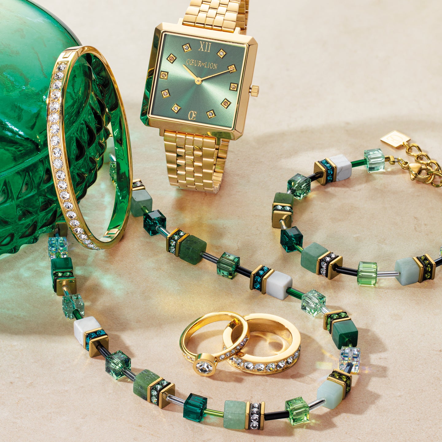 ICONIC CUBE WATCH IN GLAMOROUS GREEN The Iconic Cube Watch in Glamorous Green has a high-quality casing with faceted edges and a shiny stainless-steel strap. The colour combination of a...