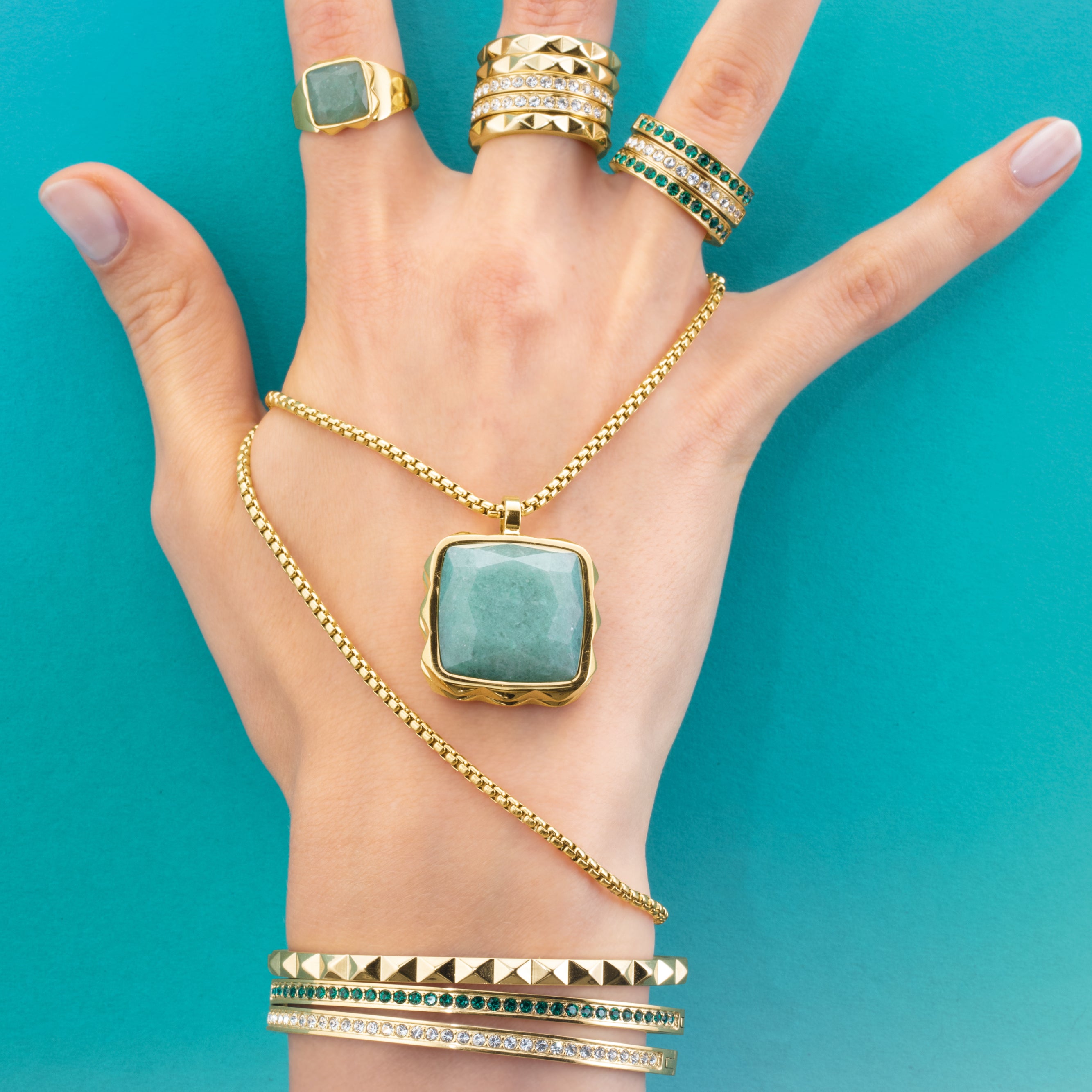 Immerse yourself in the fascinating world of our Essentials collection and complete your look with the matching rings for our stunning genuine stone necklace - Amulet Spikes Square Aventurine Gold-green....