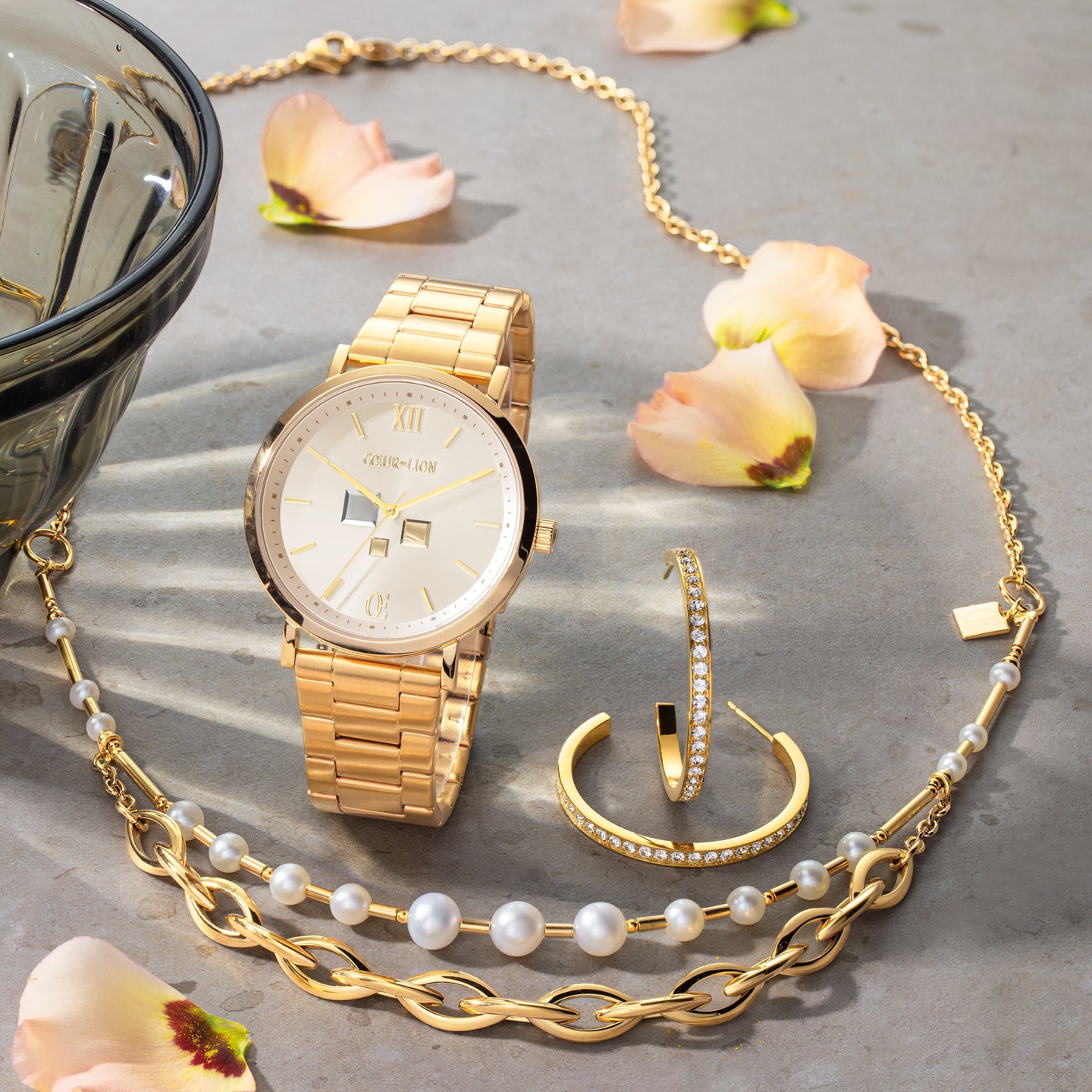 Genuine freshwater pearls make this yellow-gold trio – consisting of a sophisticated necklace, an asymmetrical bracelet and delicate hoop earrings – a graceful, elegant choice. The combination of different-sized chains...