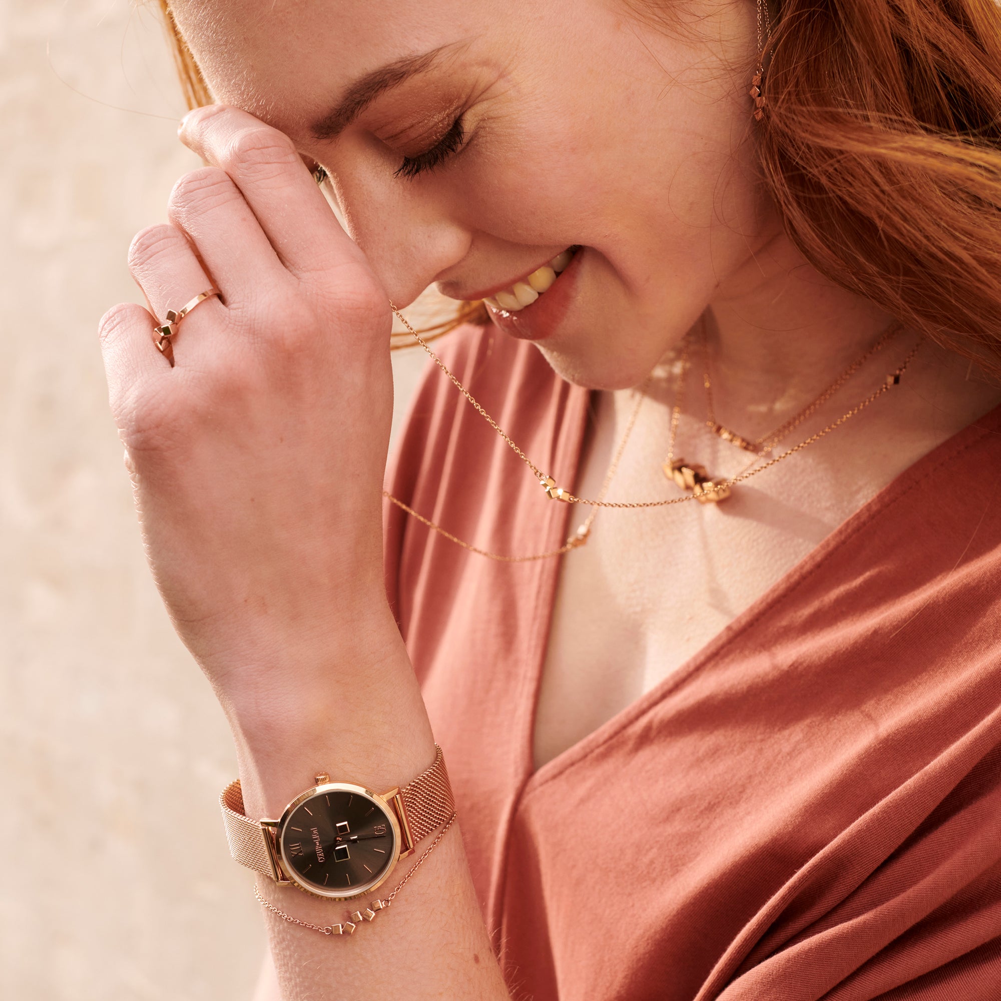 For female entrepreneurs. A Milanese strap made from rose gold stainless steel combined with a high-quality casing and a Mocha Sunray dial with fine metal applications in silver, anthracite and...