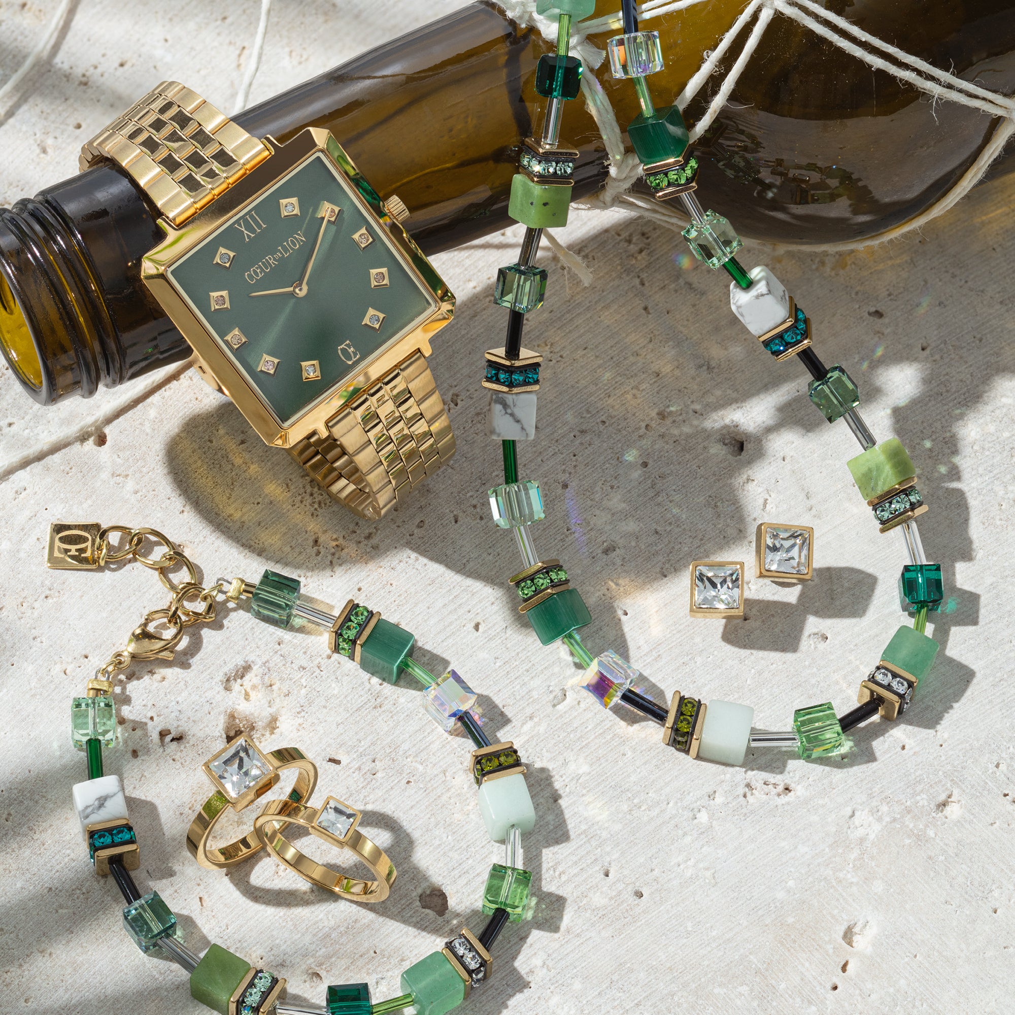 ICONIC CUBE WATCH IN GLAMOROUS GREEN The Iconic Cube Watch in Glamorous Green has a high-quality casing with faceted edges and a shiny stainless-steel strap. The colour combination of a...