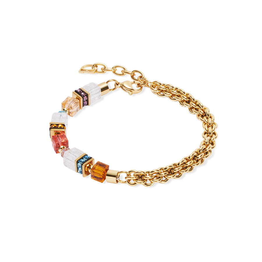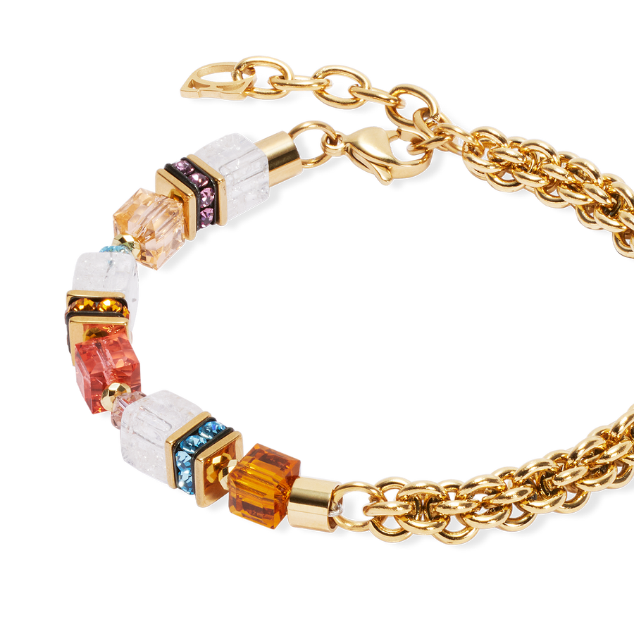 Sunshine for your wrist - the GeoCUBE® Fusion Summer bracelet gold-sunset mixes radiant Swarovski® crystals with faceted rock crystal cubes and glowing gemstones in warm orange and rosé tones. The fine stainless steel and gold chain creates a relaxed, modern look with summery elegance. Perfect for beach days & rooftop nights!