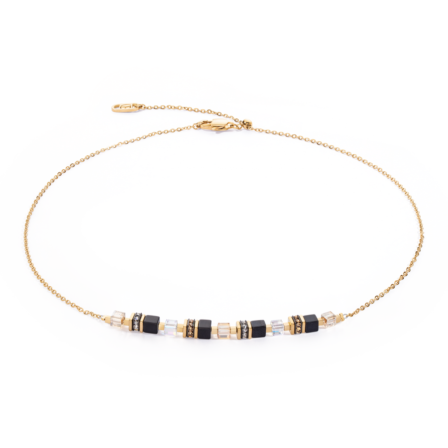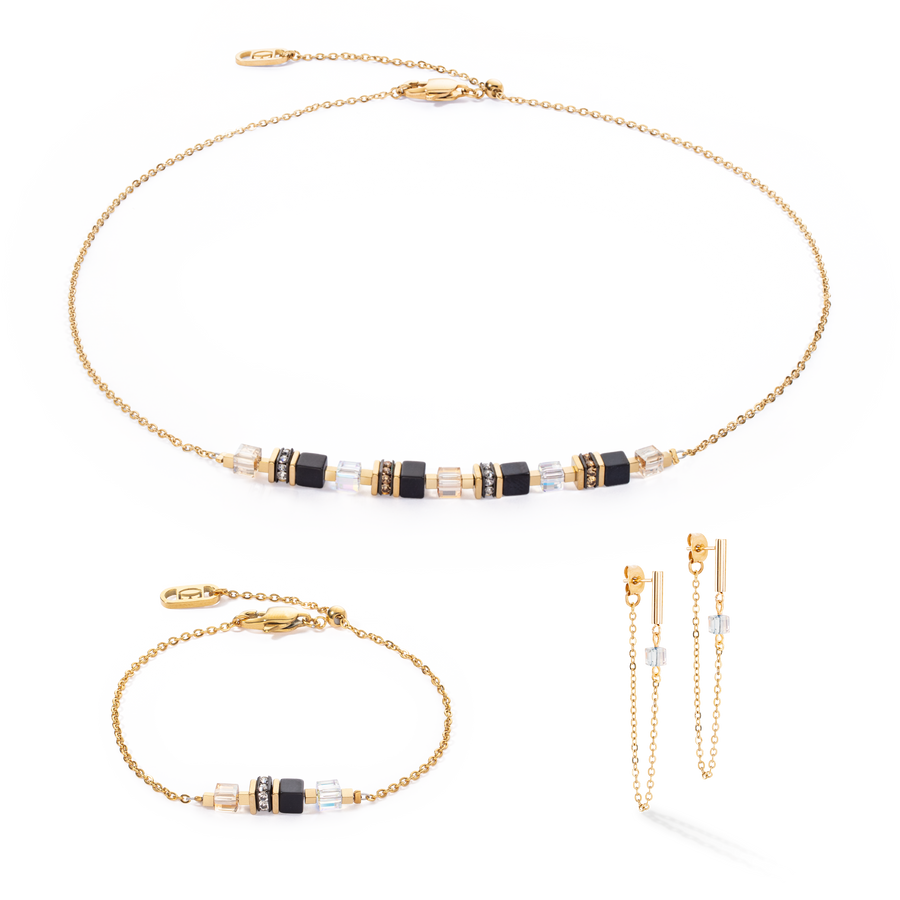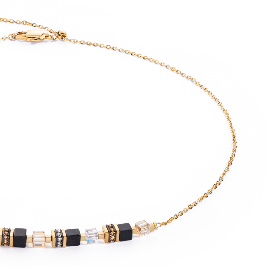 Enjoy the simple elegance of our Mini Cubes & Chain necklace in gold and black - a sophisticated piece of jewellery that enchants with its delicate design and the unique charm of the materials. This piece of jewellery combines the timeless beauty of real stone cubes, such as black onyx, with the dazzling brilliance of Swarovski crystals. The innovative sliding clasp ensures a customised fit and allows you to adjust the length of the chain as desired, ensuring optimum comfort and versatile styling options.
