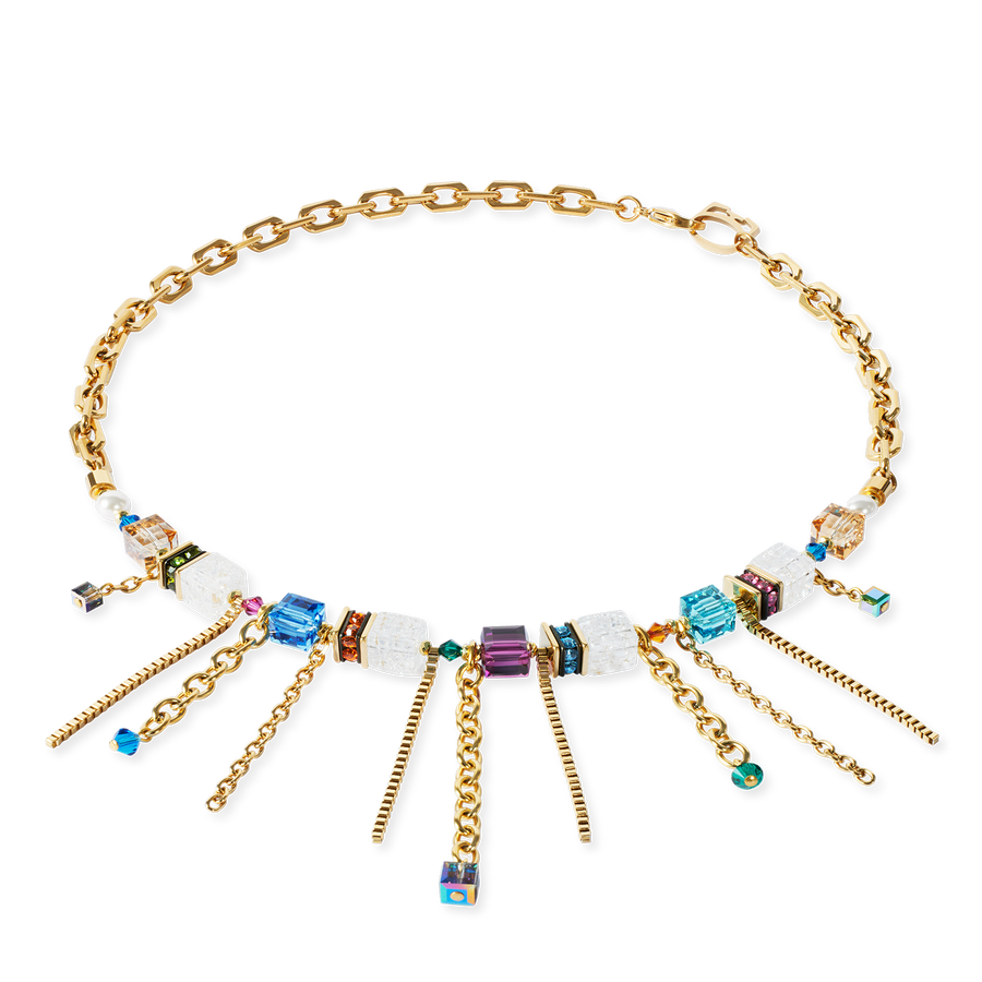 Avant-garde meets glamour - the Sunray Cube Couture gold multicolour necklace is more than just jewellery, it's a statement. Powerful rock crystal cubes, shimmering Swarovski® cubes and filigree ray elements made of gold-coloured stainless steel set a design in motion that causes a stir with every gesture. The dynamic chain details reflect the light and give the necklace an edgy, modern look - perfect for fashion-forward styles. Even more flexible? With the multi-wear option, you can extend it with the matching bracelet and give your look a whole new dimension.