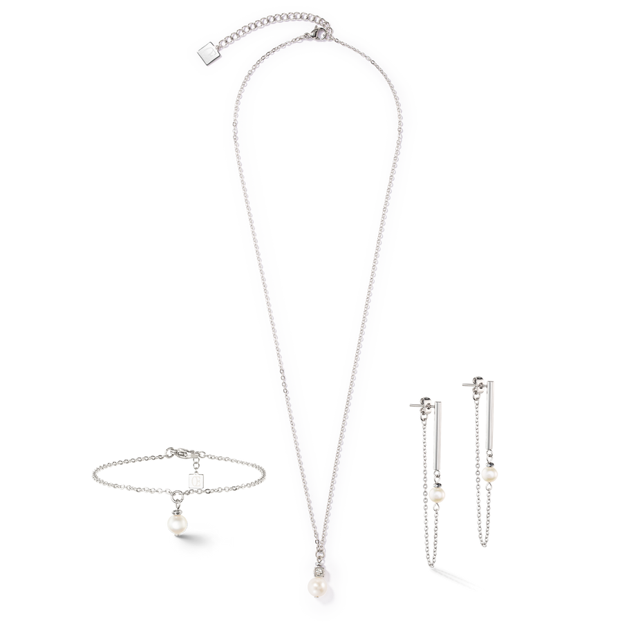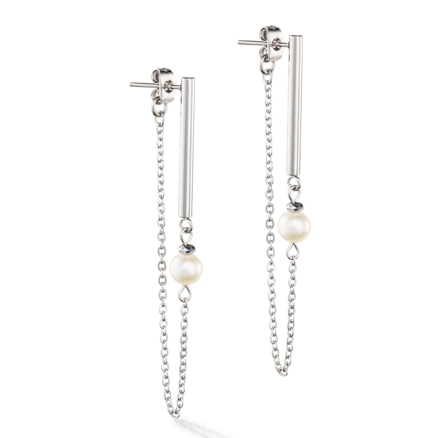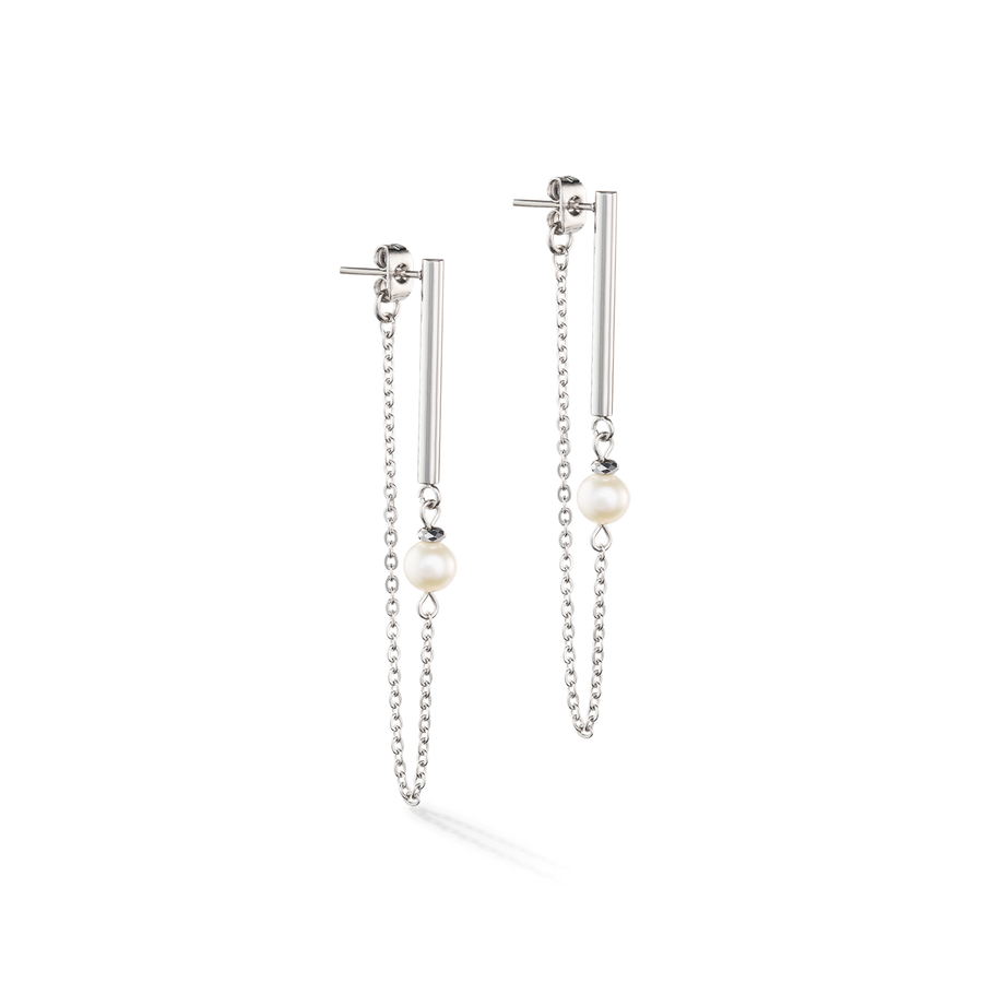 Classic materials in an unusual design. Stunning chain earrings in silver with a solitaire freshwater pearl. As usual, a matching necklace and bracelet are available