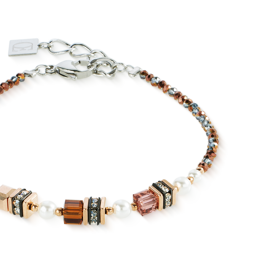 The Sparkling Princess bracelet in Mocha Mousse combines subtle brown tones with elegant rose gold, cool silver, graphic cubes and fine pearls - a harmonious mix that can be worn on its own or as a set with earrings and a necklace. The design is light, modern and goes with almost anything - from neutral to elegant.Every piece of jewellery ordered from COEUR DE LION will be delivered to you in a premium designer case and with a certificate of authenticity.
