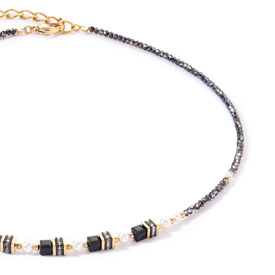Sparkling Princess gold and black necklace - timeless glamour for special occasions The "Sparkling Princess" necklace in gold and black combines classic elegance with a touch of modern chic. This filigree necklace features black, sparkling crystals that alternate harmoniously with gold-coloured elements and delicate pearls. The sophisticated design radiates pure elegance and creates stylish accents that are particularly effective during the festive season. Wear this necklace with festive outfits or add a sophisticated touch to your everyday look - the "Sparkling Princess" necklace will always be the highlight of your ensemble. Thanks to the adjustable clasp, the necklace fits perfectly and is extremely comfortable to wear.
