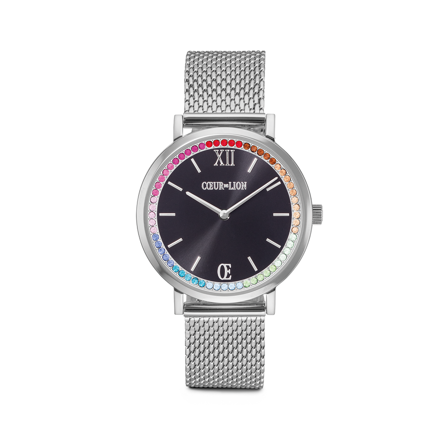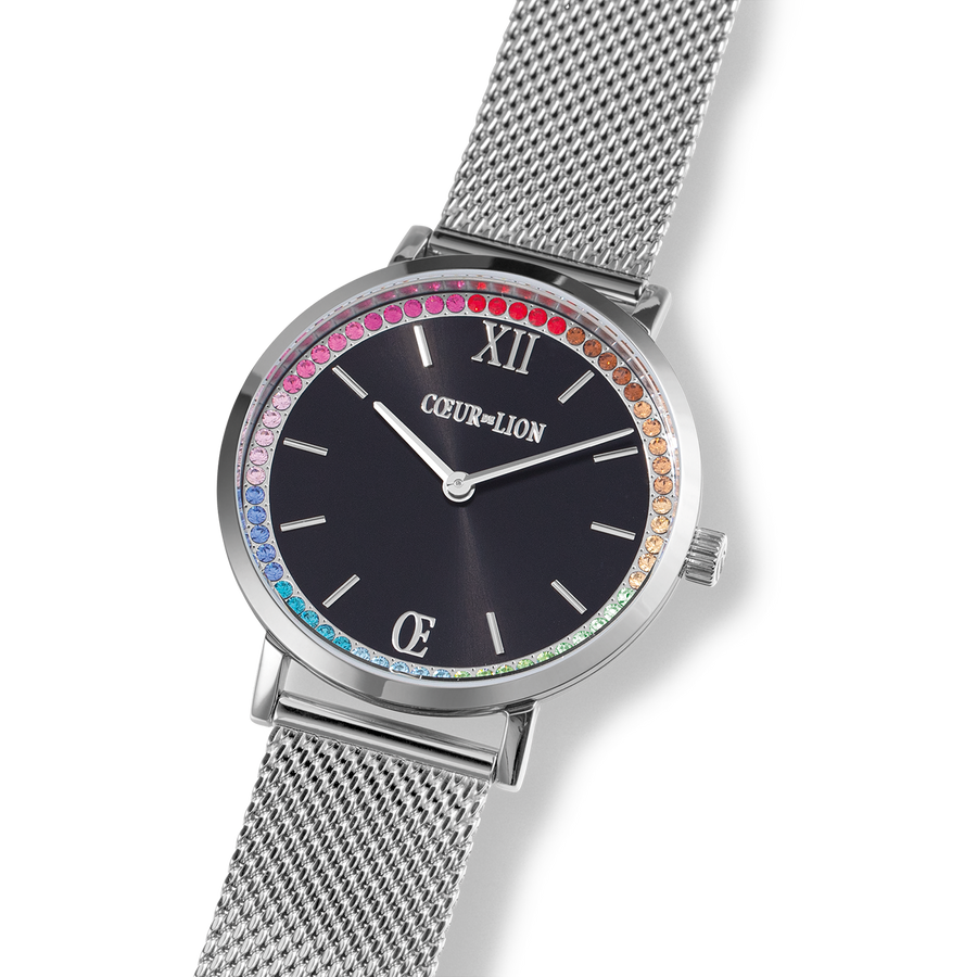 Watch Round Sparkling Rainbow Sunray Black Milanaise silver